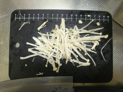 荒ぶる心をぐっと抑えて、エノキの下の部分(アバウト)を切り落としてバラバラにします^o^
